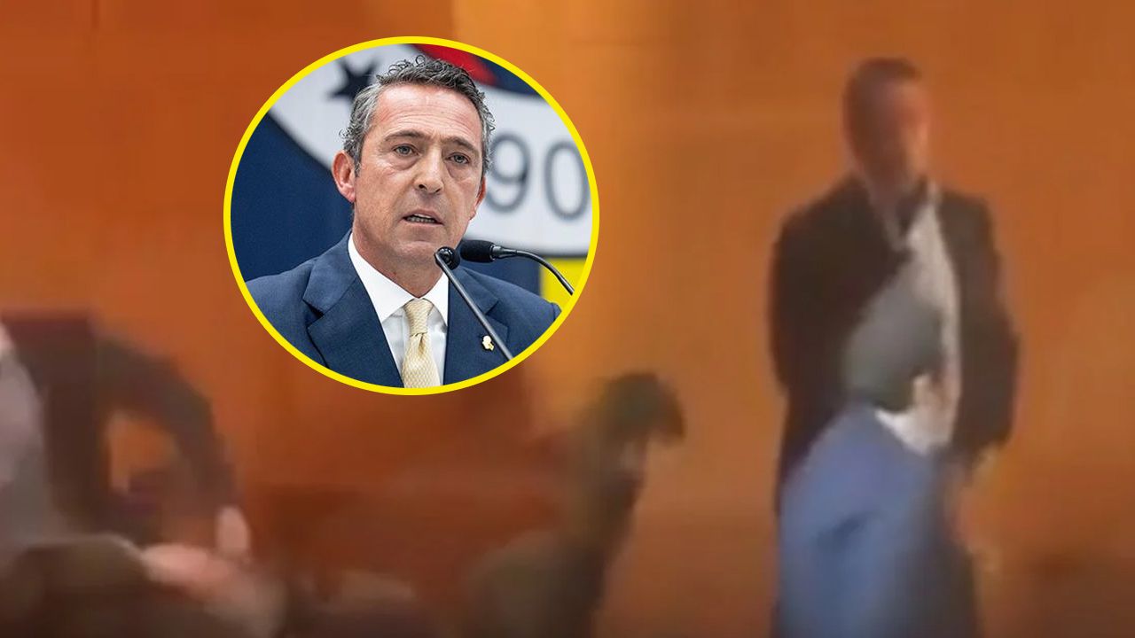 Koç, burada konuşma yaptığı sırada dengesini kaybederek yere düştü.