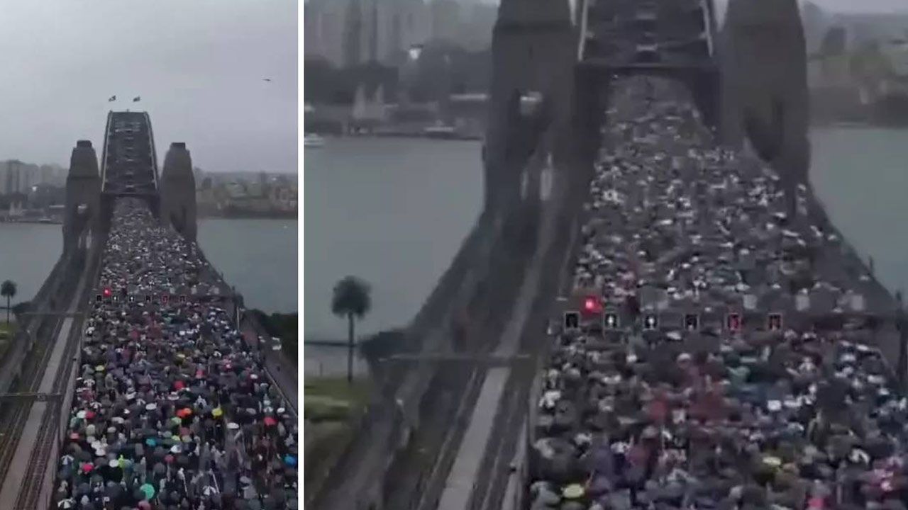 Avustralya’nın New South Wales eyaletinin Sydney kentinde Filistin'i destekleyen yaklaşık 100 bin kişi olduğu tahmin edilen kalabalık Sydney Liman Köprüsü'nde bir araya geldi.