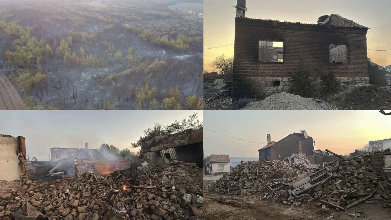 Bayramiç ilçesi Saçaklı köyünde devam eden orman yangınında çok sayıda ev zarar gördü. Bazı evler alevlerin etkisiyle yıkılırken, yangının verdiği zarar ise gün aydınlanınca ortaya çıktı. Yangından zarar gören köydeki evler ve orman havadan dron ile görüntülendi.