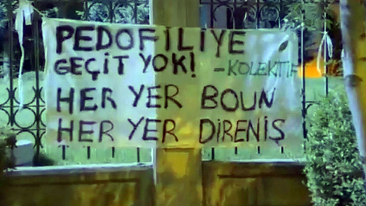 Gözaltılara tepki gösteren Ankara'da bir grup öğrenci Diyanet İşleri Başkanlığı'na "Pedofiliye Geçit Yok! Her yer BOÜN, her yer direniş" yazılı pankart astı.