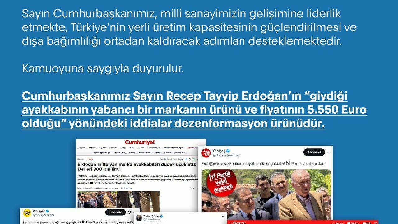 İddiaların dezenformasyon ürünü olduğu belirtilen açıklamada, "Sayın Cumhurbaşkanımızın giydiği ayakkabı, iddia edildiği gibi yabancı bir markaya ait olmayıp, tamamen yerli bir üreticinin ürünüdür. Dolayısıyla ayakkabının iddia edilen marka veya fiyatla bir ilgisi bulunmamaktadır. Sayın Cumhurbaşkanımız, milli sanayimizin gelişimine liderlik etmekte, Türkiye’nin yerli üretim kapasitesinin güçlendirilmesi ve dışa bağımlılığı ortadan kaldıracak adımları desteklemektedir" denildi.
