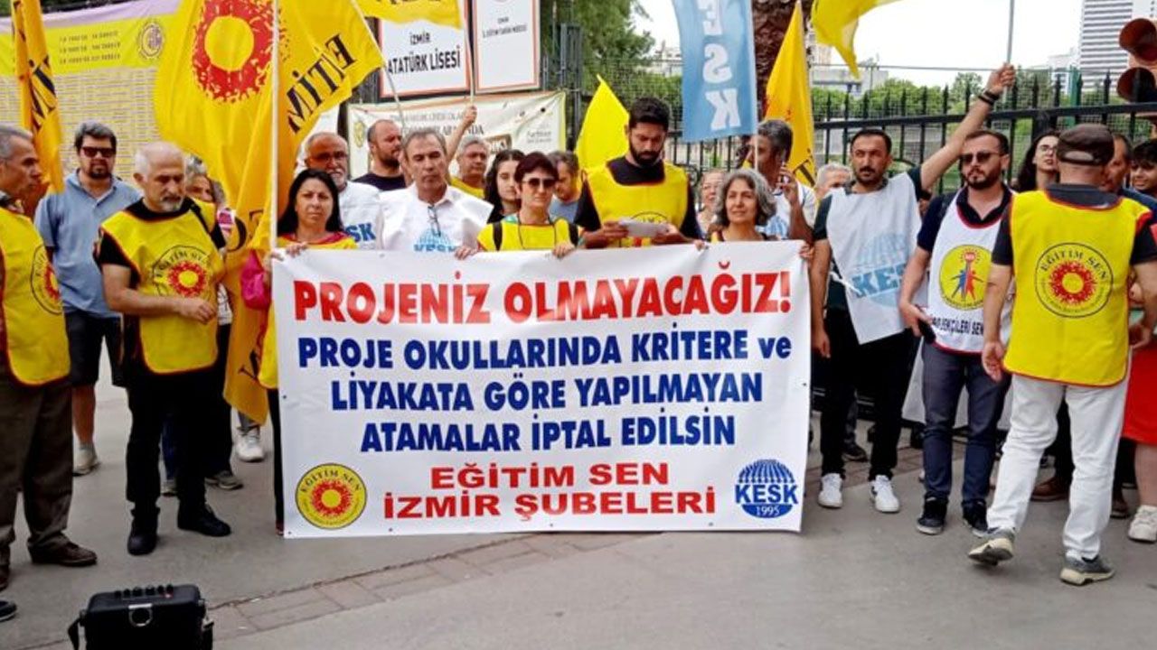 Eğitim Sen İzmir şubeleri, proje okullarına yapılan atamalarda liyakat ilkesinin göz ardı edilmesine ve siyasal kadrolaşmaya karşı Atatürk Lisesi önünde dün basın açıklaması düzenledi. Eylemde sık sık “Projeniz olmadık, olmayacağız” ve “Bilimsel, laik, demokratik eğitim” sloganları atıldı.