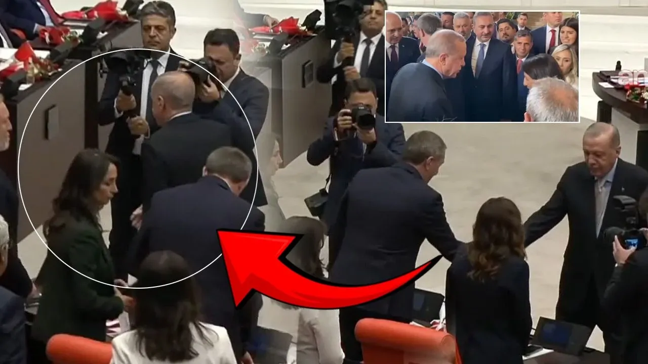 AKP'li Cumhurbaşkanı Recep Tayyip Erdoğan, kürsüye çıkarak konuşma yaptı. Erdoğan, ilk olarak ittifak ortağı MHP Genel Başkanı Devlet Bahçeli’nin yanına gitmek yerine DEM Parti sıralarına yöneldi. DEM Parti Eş Genel Başkanı Tuncer Bakırhan ve partililer Pervin Buldan, Mithat Sancar, Gülistan Koçyiğit’in ellerini sıka Erdoğan, ardından MHP ve İYİ Parti sıralarına geçerek tokalaştı.