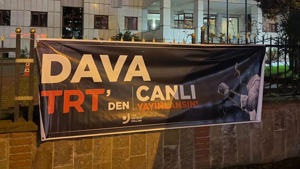 Gençler, Ekrem İmamoğlu hakkında görülen davanın kamuoyuna açık ve şeffaf şekilde yayımlanması gerektiğini savunarak, “TRT Korkma, Duruşmayı Canlı Yayınla” pankartı astı.