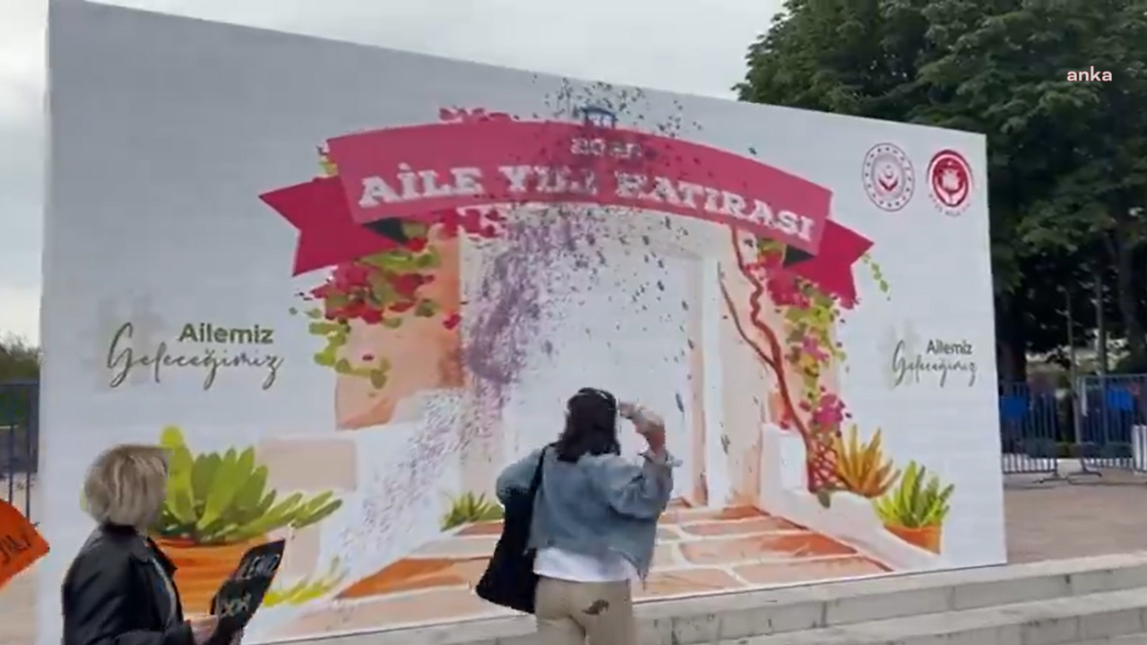 Halkevci Kadınlar, sosyal medya hesabından yaptığı paylaşımda, Güvenpark'a yerleştirilen "Aile Yılı Hatırası" panosuna mor boya fırlattıkları görüntüleri yayınladı.