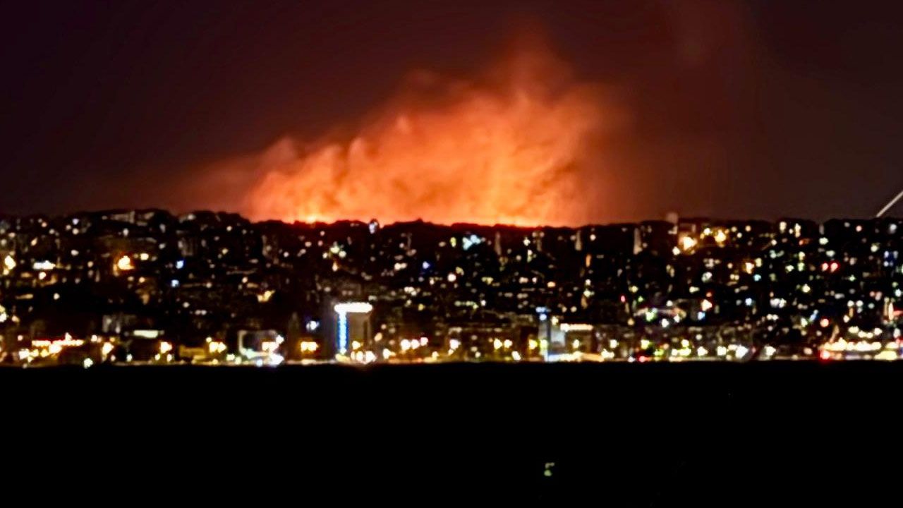 İzmir'in Buca ilçesinde bir minibüste çıkan ve ormanlık alana sıçrayan yangın, kent merkezinden görüntülendi.