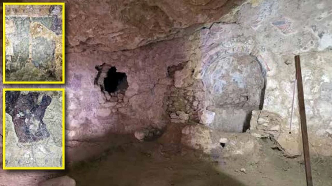 “3 bin yıl önce doğal bir mağara içine dini bir mekân oluşturmuşlar. Burası vaftizhane olarak kullanılan bir alan. Maalesef 90’lı yıllarda bu alan defineciler tarafından keşfedilmiş. Mağaranın üzerinden geniş bir çukur açıp içeri girmişler ve birden fazla kaçak kazı yapmışlar. Biz ise 2022 yılında mağaranın gerçek girişini bulduk ve bu bölümünü kazdık. İçeri girdiğimizde tüm yüzeyde duvar resimleri vardı. Bu resimleri temizlerken bir bölümde elinde kitap tutan bir figüre ulaştık. Figürün yüzünün yarısı var, elbisesi görünüyor, elinde de kitap tutuyor. Duvarları temizlemeye devam ederken karşımıza bir yazı çıktı. Orada da ‘Aziz Pavlus’ yazdığını keşfettik.