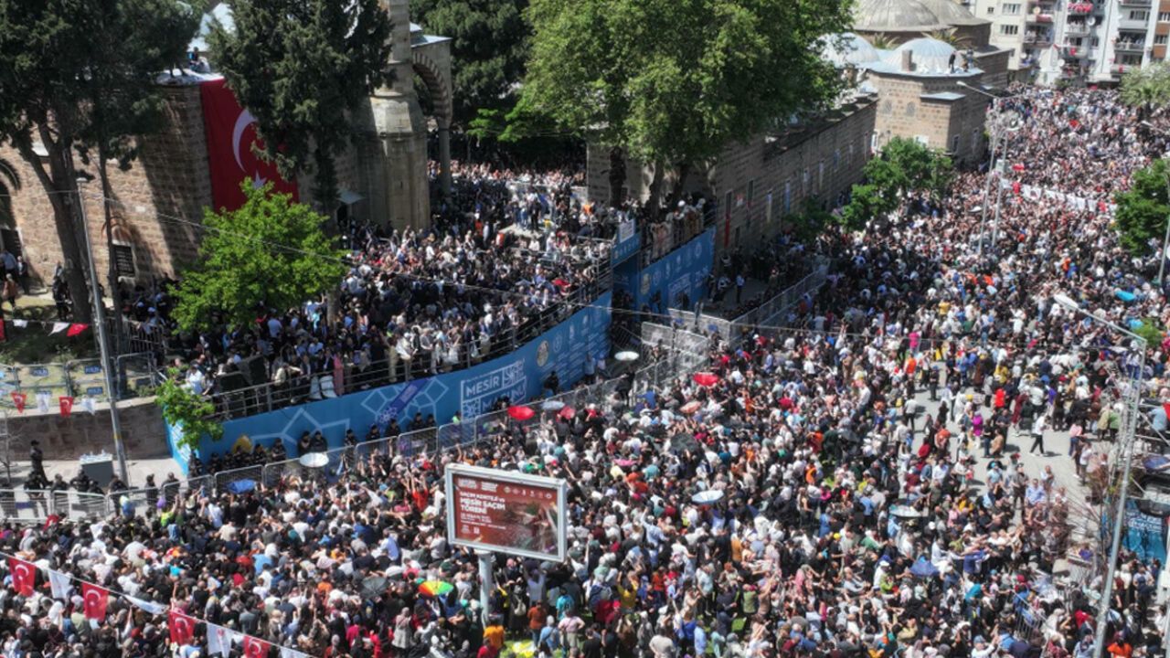 Festival kapsamında dualarla hazırlanarak paketlenen 10 ton mesir macunu, Sultan Camisi’nin kubbe ve minareleri ile çevredeki evlerin çatı ve balkonlarından vatandaşlara saçıldı.