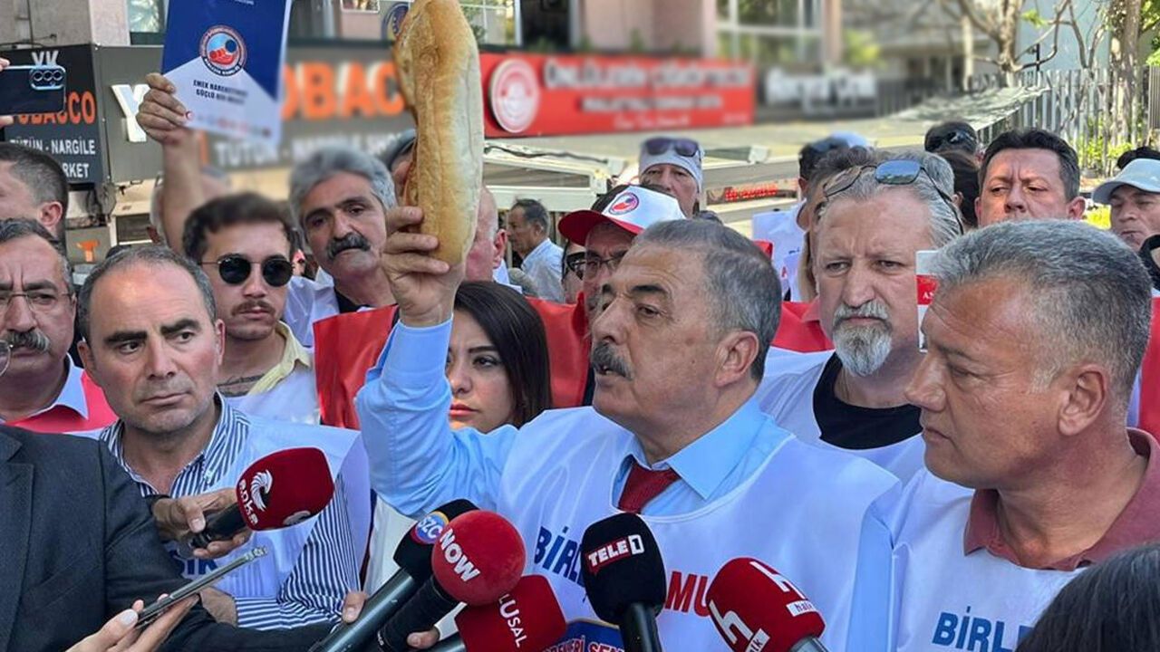 Birleşik Kamu İş-Konfederasyonu Genel Başkanı Orhan Yıldırım elinde ekmek ile açıklama yaptı Yıldırım, polisten gelen 'basın açıklamasını burada yapacaksanız çekilelim' teklifini kabul etmedi.