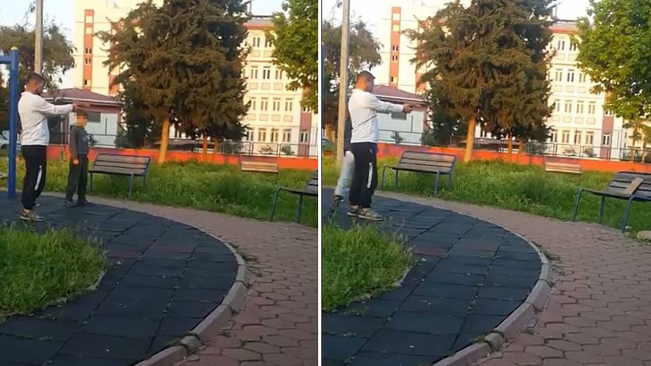 Şanlıurfa ve Kahramanmaraş'taki okul saldırıların yarattığı sarsıntıya Adana'dan gelen görüntü tuz biber ekti. Parkta oyuncak silahla atış talimi yapan çocuk ile onu yönlendiren kişi cep telefonu kamerasına yansıdı.