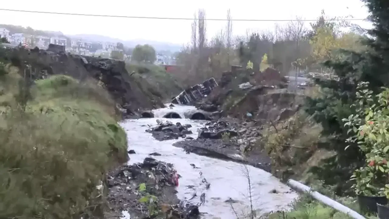 Yağışın etkisiyle Uskumruköy’deki viyadüğün altında derenin üzerinden geçen yol çöktü. Çökmenin ardından yoldaki pikapla kamyonet dereye düştü.
