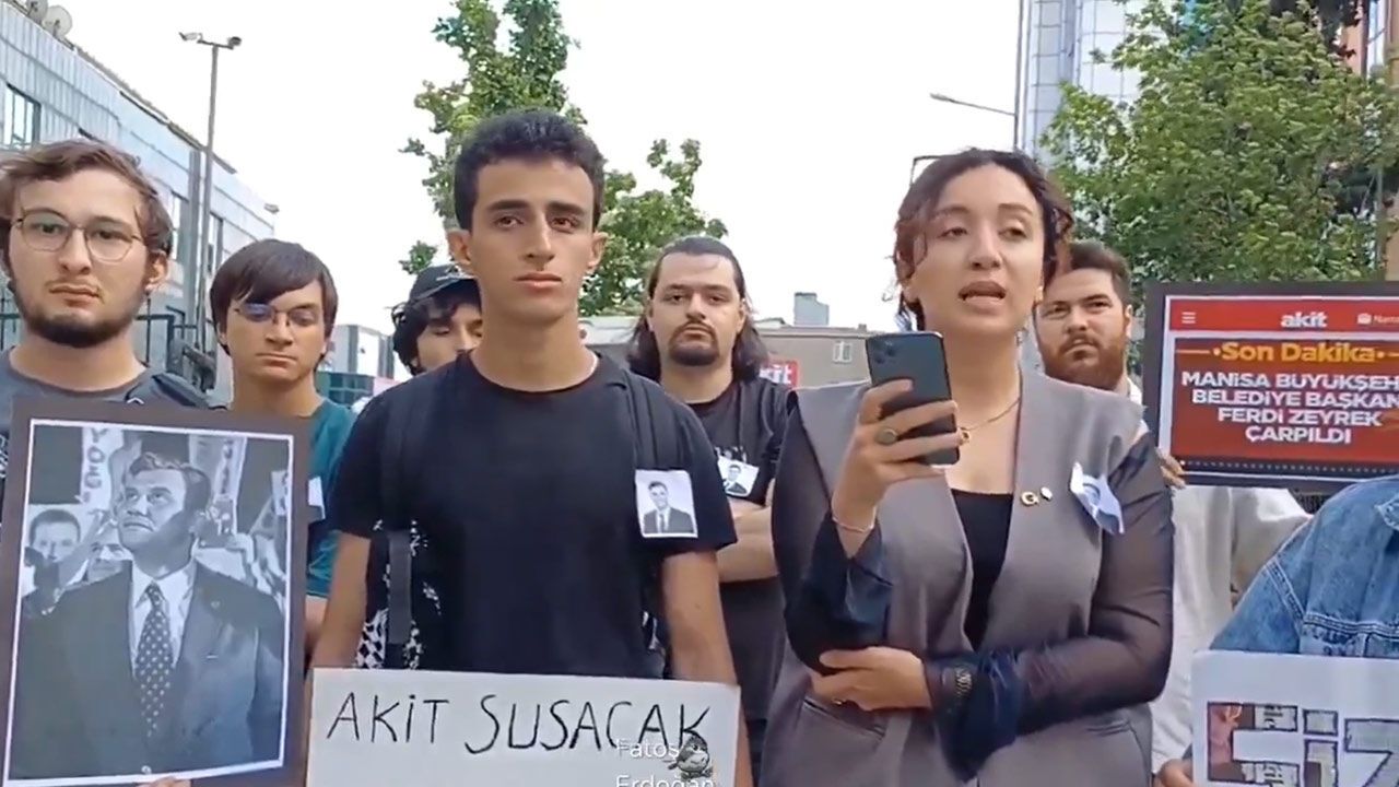 Ferdi Zeyrek'in fotoğrafını yakalarına takarak Akit binası önünde toplamak isteyen gençlerin polis tarafından engellendiği görüntülendi.