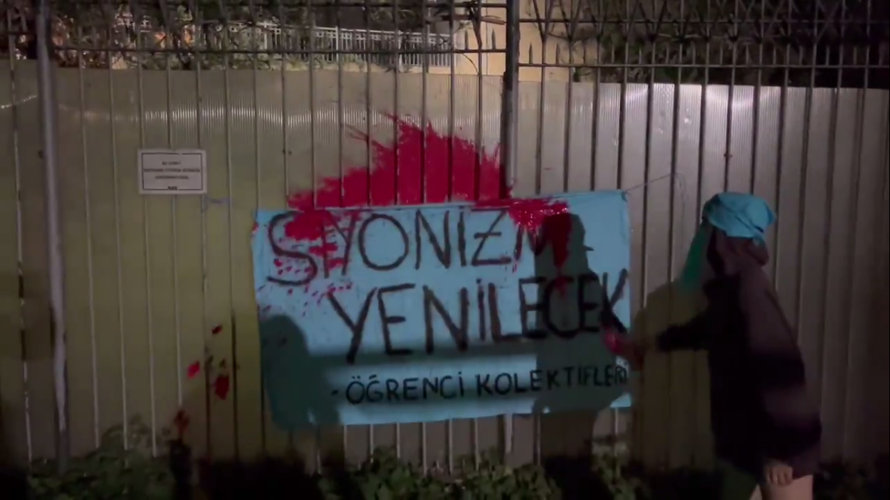 Üniversitelilerin Büyükelçilik konutunun duvarına astığı pankartta, "Siyonizm yenilecek. Öğrenci Kolektifleri" yazdığı görüldü.