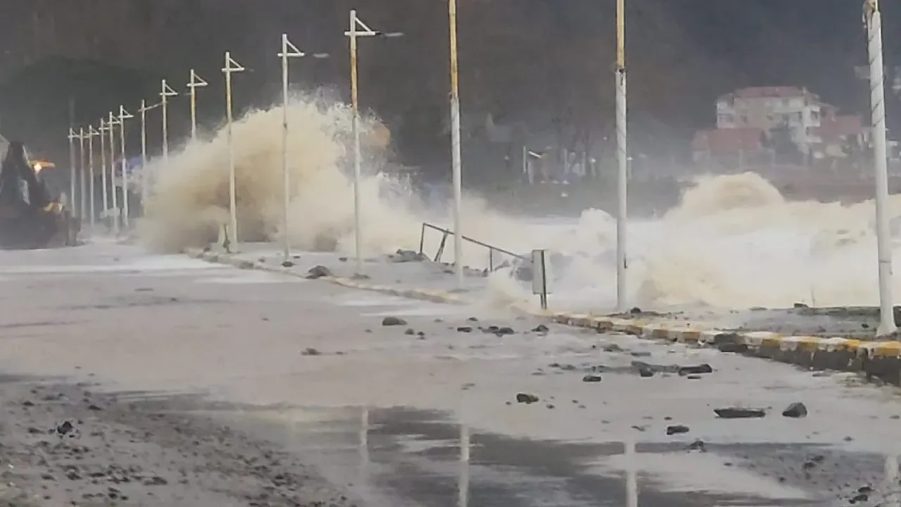 Çınarcık ilçesine bağlı Esenköy beldesinde kuvvetli rüzgarla birlikte dev dalgalar kıyıya vururken, deniz suyunun taşmasıyla sahil şeridi adeta göle döndü.